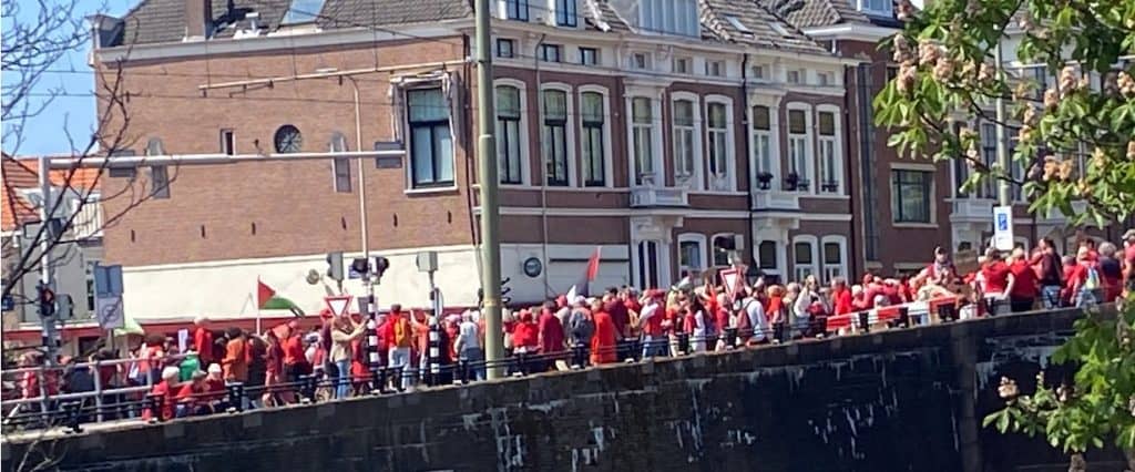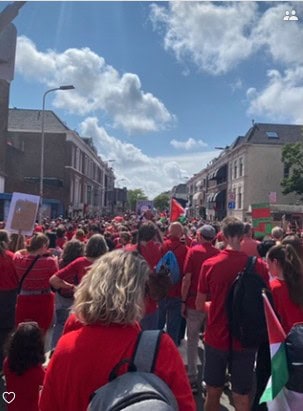 Zondag kleurde Den Haag rood. En niet alleen Den Haag. Onderweg naar de Rode Lijn-demonstratie kleurden NS-stations zó rood dat veel reizigers volgepakte treinen aan zich voorbij moesten laten gaan voordat zij koers konden zetten naar de Hofstad. Eenmaal daar sloten zij aan bij een stoet van ruim 100 duizend Nederlanders die samen een Rode Lijn trokken: tégen de Israëlische genocide in Gaza en tégen de medeplichtigheid van de Nederlandse regering daaraan.